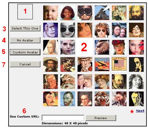 | 6. After typing in the URL (Example: http://www.mywebsite.com/images/avatar.gif), you can hit the preview button to see it in the avatar image box (1) above. It won't be saved until you click the "Select This One" button (3). | |