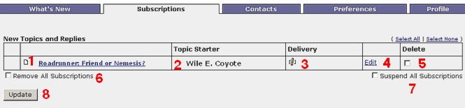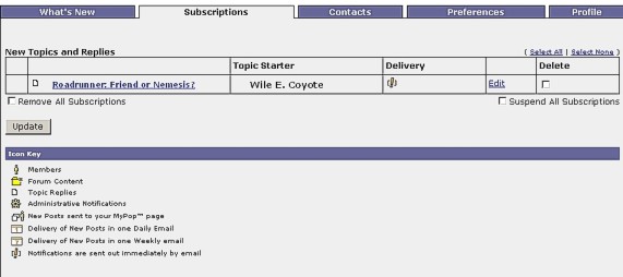 | You can flag any post and add it to your notification list by using the PopIt tool. On your subscription page you may edit your subscriptions or delete them. You can also edit your preferences directly from the email you receive from the UBB application. |